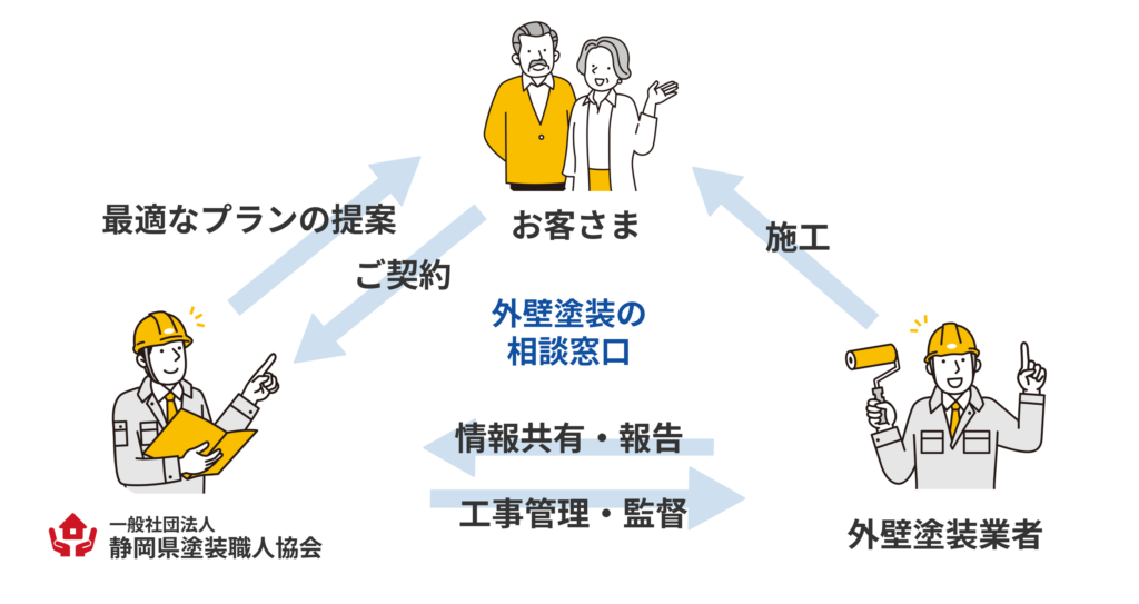 中立な立場でお客さまと塗装業者を繋ぎ工事終了まで責任を持ってサポートします